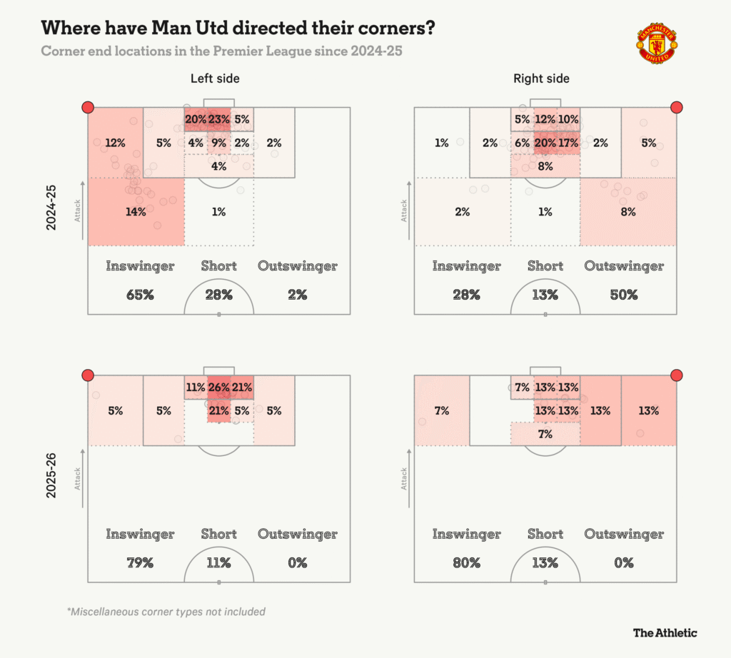 تغییر دیگری که در ضربات ایستگاهی به چشم می‌خورد، کنار گذاشتن کرنرهای کوتاه و ارسال‌های عقب‌تر از محوطه هجده‌قدم است. این تصمیم در مجموع تأثیر مثبتی گذاشته است. منچستریونایتد تا اینجای فصل سه گل از روی ضربات ایستگاهی به ثمر رسانده و میانگین ۰.۴۹ گل مورد انتظار (xG) از این موقعیت‌ها ثبت کرده است.